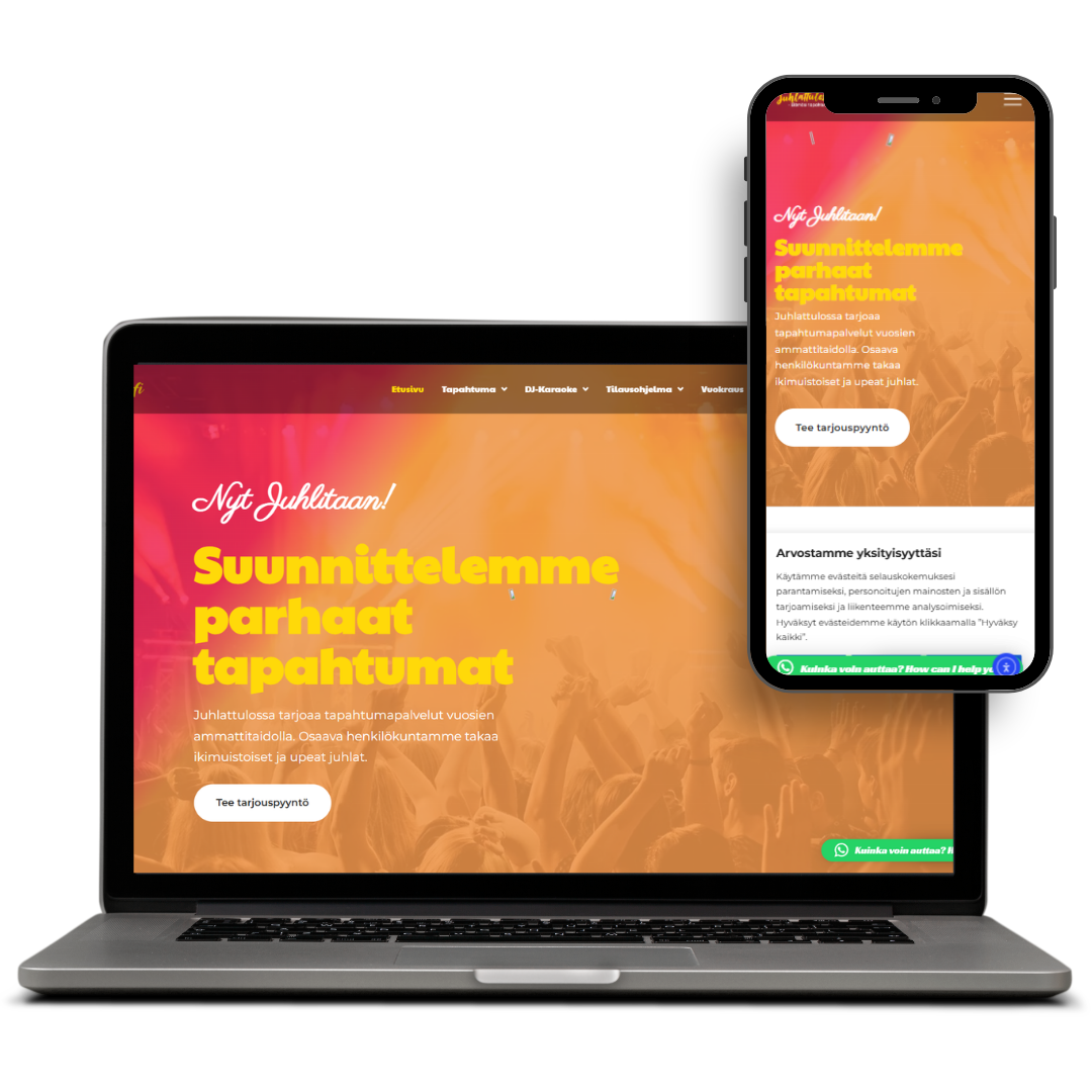 Suunnittelimme ja toteutimme Juhlattulossa.fi avaimet käteen -periaatteella modernin verkkosivun uniikista visuaalisesta ilmeestä helppokäyttöiseen palvelukokonaisuuteen.